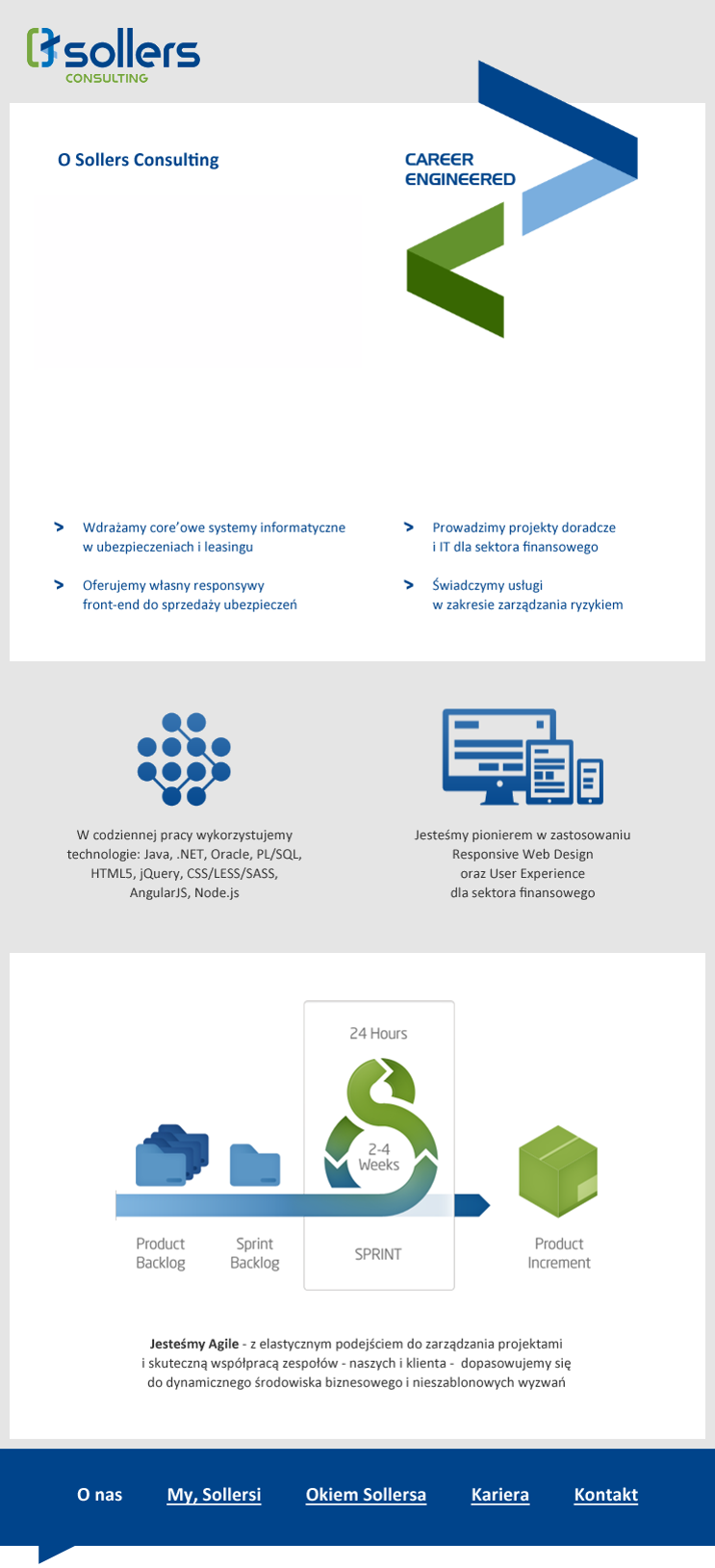 Jesteśmy zespołem ponad 600 profesjonalistów, którzy budują cyfrową przyszłość dla największych światowych ubezpieczycieli, banków i firm leasingowych. Nasza historia doradztwa biznesowego i wdrażania oprogramowania sięga roku 2000. Sollers Consulting ma swoje korzenie w Europie, jednak ślad firmy jest widoczny na całym świecie. Nasze zespoły pracują obecnie w biurach w Warszawie, Kolonii, Tokio, Lublinie, Kopenhadze i Poznaniu. Zwinność naszej firmy i prowadzonych projektów pozwala nam odgrywać aktywną rolę w branżach o wysokich potrzebach w zakresie digitalizacji.