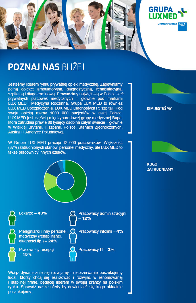 Jesteśmy największą prywatną grupą medyczną w Polsce, opiekujemy się 2 500 000 Pacjentów i zatrudniamy już ponad 17 500 specjalistów różnych dziedzin. Od niemal 30 lat stale się rozwijamy, otwierając kolejne centra medyczne, a także uruchamiamy nowe linie biznesowe. Pomagamy w dłuższym, zdrowszym i szczęśliwszym życiu oraz czynimy świat lepszym. Troszczymy się o naszych Pacjentów, zapewniając im kompleksową opiekę medyczną oraz dbając o profilaktykę i ekologię. Jesteśmy częścią międzynarodowej grupy Bupa, która od ponad 70 lat świadczy usługi medyczne i ubezpieczeniowe na całym świecie. Dołączając do nas zyskujesz możliwość rozwoju w największej i najszybciej rozwijającej się firmie ochrony zdrowia w Polsce.