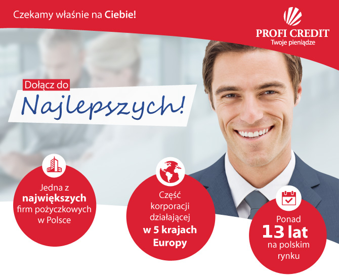 PROFI CREDIT jest drugą największą firmą pożyczkową w Polsce. Działamy na polskim rynku od ponad 13 lat i współpracujemy z grupą 2 900 doradców finansowych. Od początku działalności w Polsce sprzedaliśmy pożyczki na łączną wartość ponad 3,3 miliarda złotych. Mierzymy jednak coraz wyżej i w roku 2017 przeprowadzamy intensywną rozbudowę naszej sieci sprzedaży.