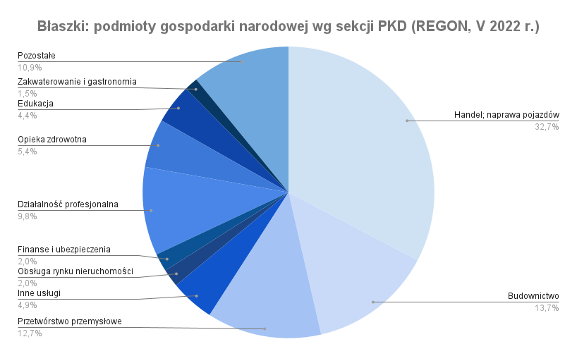 Położone w bliskiej odległości duże ośrodki miejskie są swego rodzaju konkurencją dla mniejszych miejscowości – przyciągają ludzi w wieku produkcyjnym, oferując im szersze możliwości edukacyjne i zawodowe. Nie oznacza to jednak, że w Błaszkach nie rozwija się przedsiębiorczość. W maju 2022 r. w gminie Błaszki zarejestrowanych w rejestrze REGON było 1001 podmiotów gospodarki narodowej, w samym mieście – 205, z czego 10 z sektora publicznego. W mieście dominują mikrojednostki. Jest ich 188. Czternastu pracodawców zatrudnia między 10 a 49 osób, a trzech między 50 a 249.