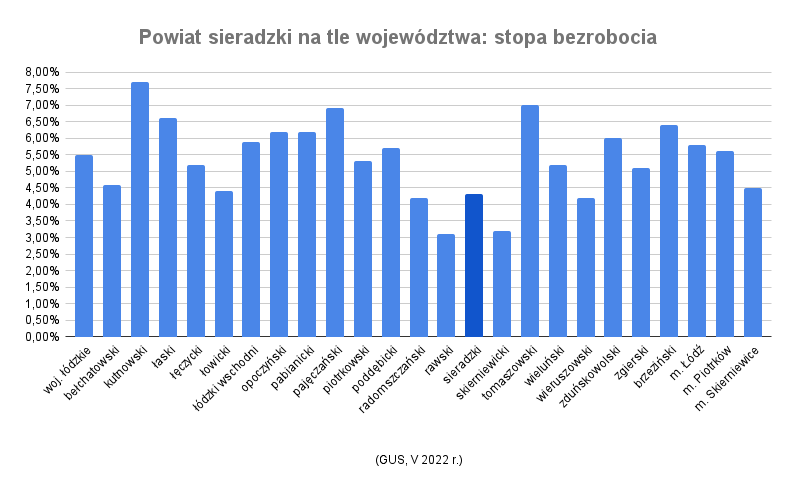 Stopa bezrobocia w powiecie w końcu maja 2022 r. wynosiła 4,3%, bez pracy pozostawało 2,3 tys. mieszkańców. Dla porównania, wojewódzki wskaźnik bezrobocia był w tym samym czasie na poziomie 5,5%, a ogólnopolski 5,1%. Jak prezentuje się powiat sieradzki na tle innych powiatów i miast na prawach powiatu w Łódzkiem?