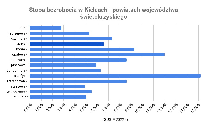 Czy trudno o pracę w powiecie kieleckim? Zgodnie z danymi Głównego Urzędu Statystycznego stopa bezrobocia w tym powiecie w końcu maja 2022 r. wynosiła 6,6%. To więcej niż wartość wskaźnika ogólnopolskiego (5,1%), niemniej na tle województwa powiat kielecki wypada całkiem nieźle.