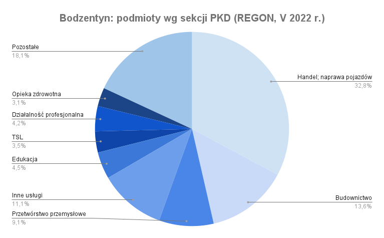 Czy miasto i gmina Bodzentyn to obszar, gdzie rozwinęła się lokalna przedsiębiorczość? Na terenie miasta działa 287 podmiotów gospodarki narodowej (stan REGON na 30 maja 2022 r.). W gminie jest ich łącznie 926. Ani w samym Bodzentynie, ani w obrębie gminy nie ma dużych przedsiębiorstw.