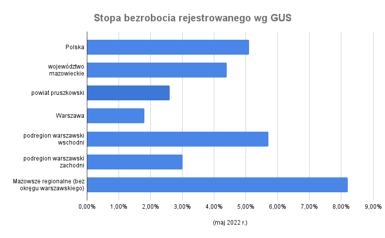 Według danych Głównego Urzędu Statystycznego w maju 2022 r. stopa bezrobocia w powiecie pruszkowskim wyniosła 2,6%, była zatem zdecydowanie poniżej średniej wojewódzkiej, jak i krajowej.