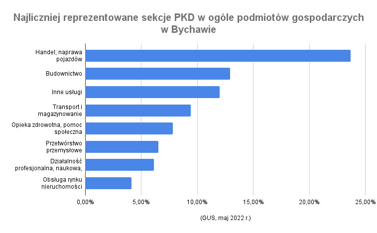 Bychawscy przedsiębiorcy zdecydowanie stawiają na handel i naprawę pojazdów – ta sekcja PKD jest najliczniejsza (121 firm). Wiele podmiotów zajmuje się też różnorodnymi usługami, budownictwem, transportem i gospodarką magazynową, opieką zdrowotną i pomocą społeczną, działalnością profesjonalną, naukową i techniczną oraz przetwórstwem przemysłowym.