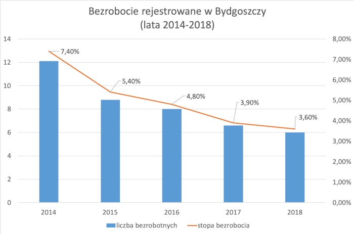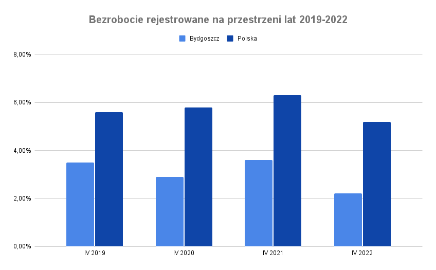 Z roku na rok możemy zaobserwować liczne zmiany na rynku pracy nie tylko w województwie, ale także na terenie miasta. W przypadku Bydgoszczy rynek pracy na przestrzeni ostatnich lat zmierzył się z ogromnymi wyzwaniami. Jeszcze w 2014 roku stopa bezrobocia kształtowała się tu na poziomie 7,4%. Wartość ta spadała z roku na rok i tak pod koniec 2018 roku wynosiła już 3,6%, a rok później, w grudniu 2019 roku, już tylko 2,8%. Był to zarazem najniższy poziom wskaźnika bezrobocia od początku lat 90. Zgodnie z danymi z kwietnia 2022 r. stopa bezrobocia w Bydgoszczy była jeszcze niższa – 2,2%. Według danych Powiatowego Urzędu Pracy w końcu kwietnia 2022 roku liczba zarejestrowanych bezrobotnych w mieście wynosiła 3,6 tys. osób.