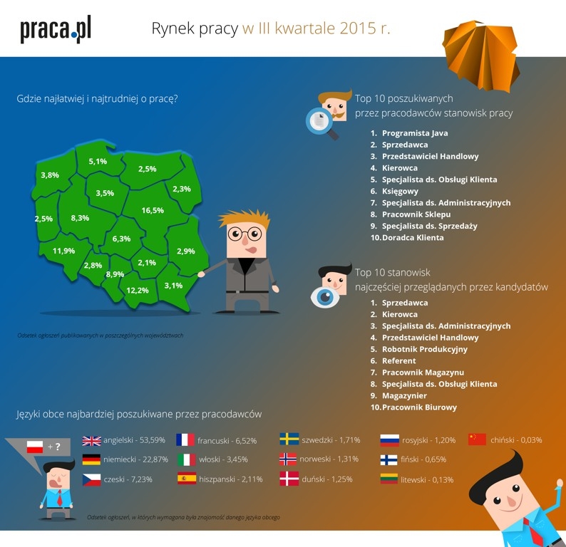 Podaż pracy wydaje się spójna z ofertą pracodawców. Najwięcej ofert pracy dotyczyło Sprzedaży i Obsługi Klienta – 30% wszystkich ofert pracy koncentrowało się właśnie na tym obszarze. Choć w sprzedaży nadal najłatwiej o pracę, to porównując ilość ofert pracy w sektorze do analogicznego okresu ubiegłego roku, widać 5% spadek popytu na pracowników. Podobna sytuacja ma miejsce w obszarze IT. Wprawdzie 15% wszystkich ofert pracy dotyczyło w Q3 2015 roku programowania, a 10% Administracji IT, to w porównaniu zarówno do ubiegłego roku jak i poprzedniego kwartału widać nieznaczny spadek udziału tych ofert w całości ogłoszeń. W tej branży nadal niepodzielnie króluje Java – jest to najbardziej poszukiwany przez pracodawców język programowania. Wzrosła natomiast ilość pracy dla pracowników fizycznych. Jest to związane nie tylko z okresem wakacyjnym, ale ogólnie ożywieniem gospodarki. W analogicznym okresie ubiegłego roku praca fizyczna stanowiła 10% wszystkich ogłoszeń. Obecnie – ponad 13%.
