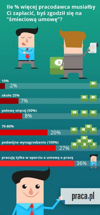 Co piąty Polak (20%) oczekiwałby o połowę wyższego wynagrodzenia, a 27% zgodziłoby się na zlecenie czy dzieło tylko gdyby wynagrodzenie było podwójne. Z analizy odpowiedzi ankietowanych wynika, że umowy cywilnoprawne, zwane w Polsce popularnie „śmieciowymi”, nie są postrzegane przez pracowników jako atrakcyjne i dopiero rzeczywiście znacząca różnica pomiędzy zarobkami w oparciu o etat a umowę zlecenie lub dzieło, mogłaby skłonić pracownika do tego, by przyjąć umowę nie gwarantującą stabilizacji, płatnego urlopu czy zabezpieczenia na wypadek choroby.