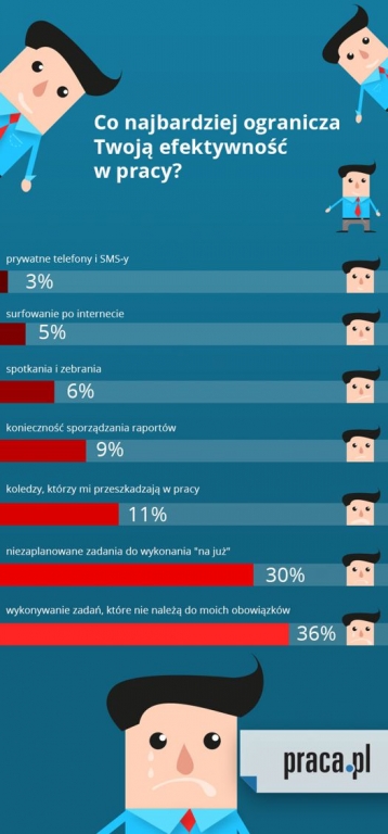 Serwis pracy Praca.pl zapytał swoich użytkowników o to, co najbardziej – ich zdaniem – ogranicza efektywność w pracy. Wbrew temu co myślą szefowie, nie jest to surfowanie po internecie czy prywatne rozmowy telefoniczne, ale kwestia niedokładnego określenia obowiązków w pracy oraz nagłe, pilne zadania.