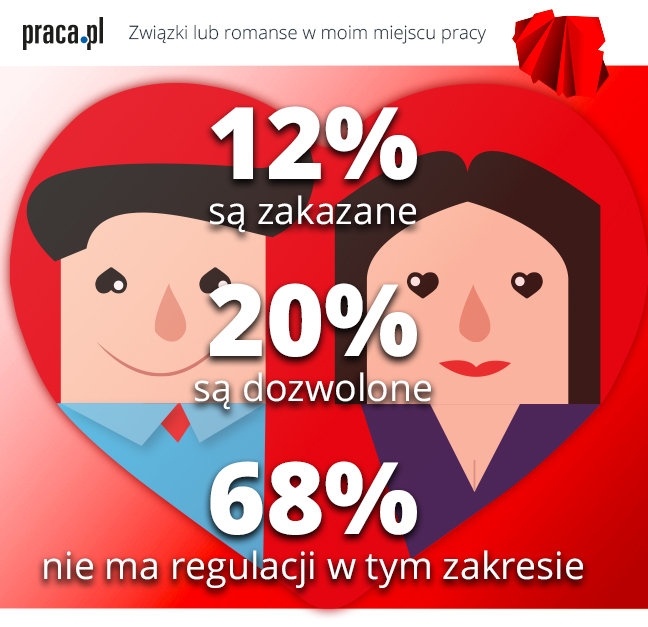 Badania serwisu pracy Praca.pl przeprowadzone wśród użytkowników serwisu pokazują, że większość firm w Polsce nie stosuje żadnej polityki wobec związków czy romansowania w pracy. O ile w 12% przedsiębiorstw takie relacje są wyraźnie zakazane, a w 20% dopuszczalne, to 68% firm nie ma żadnych regulacji w tym zakresie.