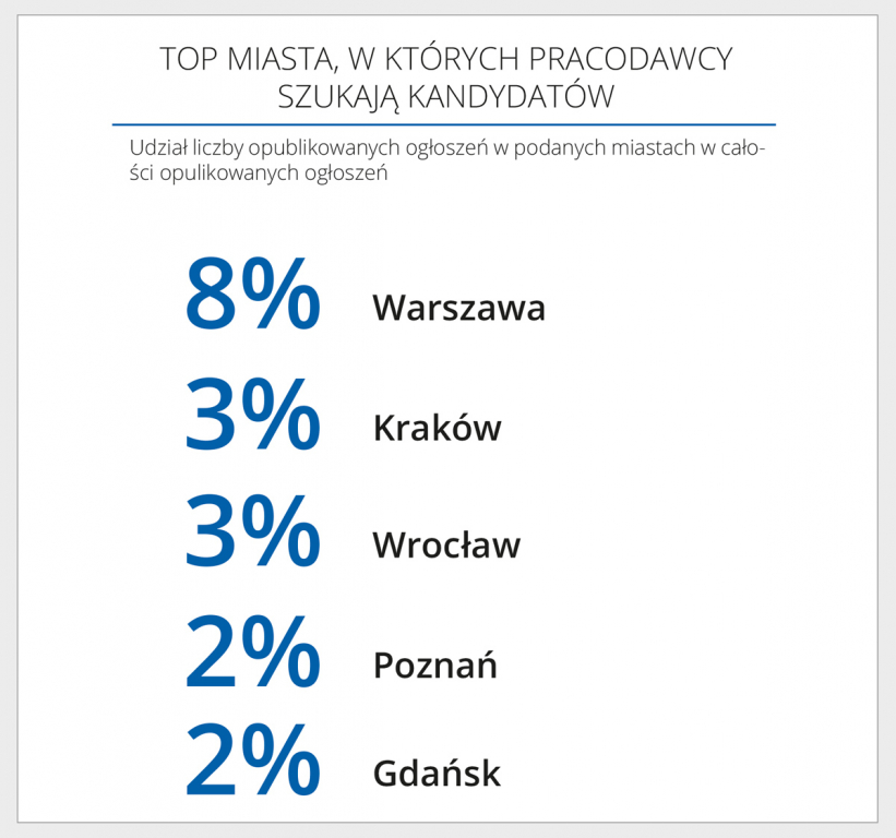 Inny był też rozkład geograficzny publikowanych ogłoszeń. W trzecim kwartale 2018 roku 25% wszystkich ogłoszeń dotyczyło pracy w 5 największych miastach w Polsce, w kwartale czwartym już tylko 18%, oznacza to, że zwiększyła się ilość publikacji ogłoszeń w mniejszych miastach.