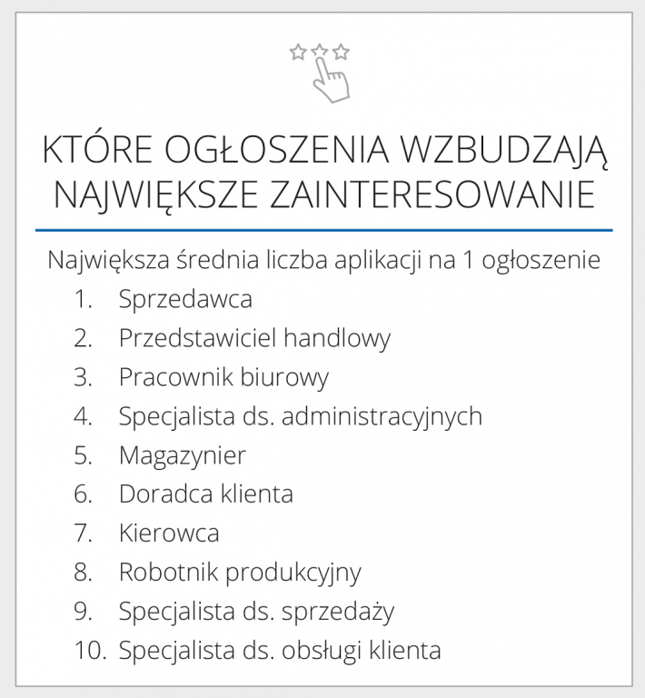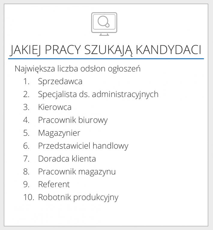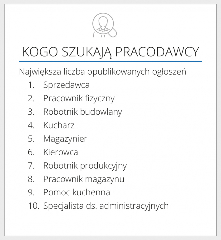 Niezmienna natomiast pozostaje pozycja sprzedawcy, który jest najbardziej poszukiwanym stanowiskiem zarówno przez pracodawców, jak i pracowników. Na czele zestawienia, podobnie jak w poprzednich miesiącach są również stanowiska związane z pracą w administracji. Kandydaci odpowiadają także na zapotrzebowanie pracodawców i chętnie aplikują na stanowiska związane z pracą fizyczną.