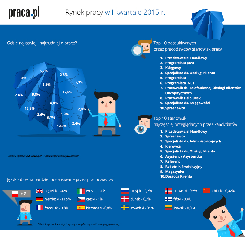 Pierwszy kwartał 2015 roku nie przyniósł niespodzianek jeśli chodzi o strukturę najbardziej poszukiwanych stanowisk. Nadal najbardziej pożądani są programiści i specjaliści IT oraz osoby zajmujące się sprzedażą i obsługą klienta. Branże takie jak bankowość nieco wyhamowały, a do sezonu przygotowują się firmy budowlane i produkcyjne, w których rośnie zapotrzebowanie na pracowników fizycznych. Nieznaczny spadek oczekiwań pracodawców w zakresie znajomości języków obcych jest spowodowany właśnie przez tę zmianę w zakresie poszukiwanych pracowników. Pracodawcy nie tyle rezygnują z języków obcych, co w większym stopniu niż w poprzednim roku poszukiwane były osoby, od których nie wymaga się języka niemieckiego czy angielskiego.