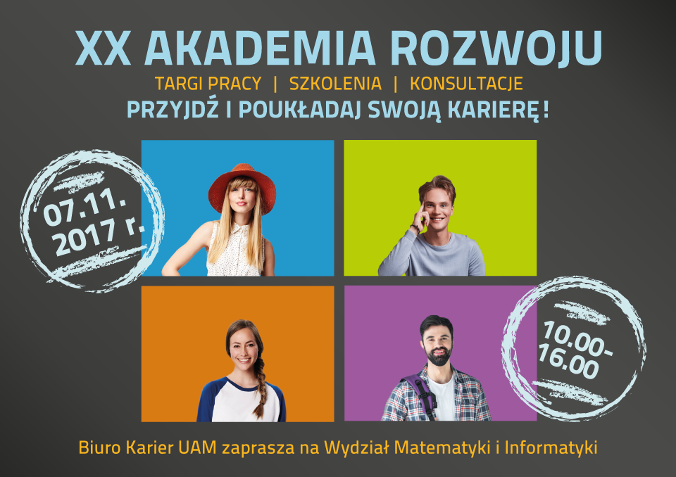 Po 20 latach czas na zmiany, tak więc w tym roku Biuro Karier UAM zaprasza studentów oraz absolwentów na jubileuszową - XX Akademię Rozwoju (dawniej Akademia Rozwoju i Przedsiębiorczości), która odbędzie się 7 listopada w godzinach 10.00 – 16.00 na Wydziale Matematyki i Informatyki (Campus Morasko).