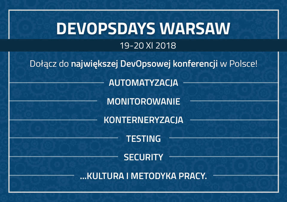 Już 19-20 listopada rusza piąta, polska odsłona międzynarodowej konferencji - DevOpsDays. Po olbrzymim sukcesie poprzedniej edycji, w tym roku będzie jeszcze więcej prelekcji, jeszcze bardziej międzynarodowe towarzystwo i zupełnie nowe miejsce - Wyższa Szkoła Menedżerska w Warszawie! Poza tym jak zawsze możecie liczyć na szerokie grono najlepszych specjalistów, openspace’y, networking oraz wspaniałą zabawę! Na scenie natomiast wystąpią eksperci z Microsoft Azure, Container Labs czy Schibsted.