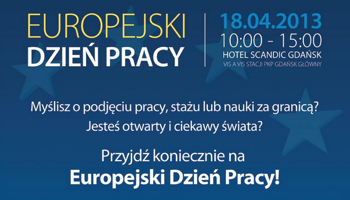 18 kwietnia 2013 r. odbędzie się Europejski Dzień Pracy organizowany przez Wojewódzki Urząd Pracy w Gdańsku. Celem wydarzenia jest promocja mobilności edukacyjnej i zawodowej w Europie, informowanie o zasadach bezpiecznego poruszania się po rynku pracy, o warunkach życia i pracy oraz sytuacji na rynkach pracy w poszczególnych krajach europejskich. Doradcy EURES będą promować wśród mieszkańców Pomorza swoje regionalne rynki pracy oraz udzielać informacji na temat życia i pracy za granicą.