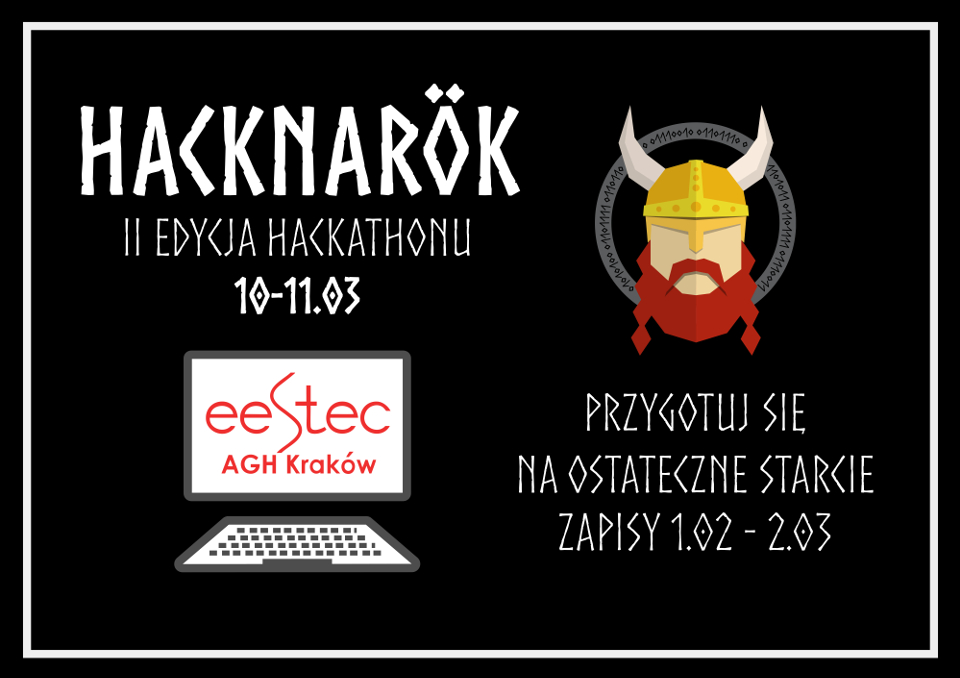 Hacknarök odbędzie się 10-11 marca 2018 w Krakowskim Parku Technologicznym. Zapisy trwają do 2 marca i odbywają się przez formularz na stronie https://hacknarok.eestec.agh.edu.pl. Do 24-godzinnych zmagań zostanie zaproszonych 80 studentów.