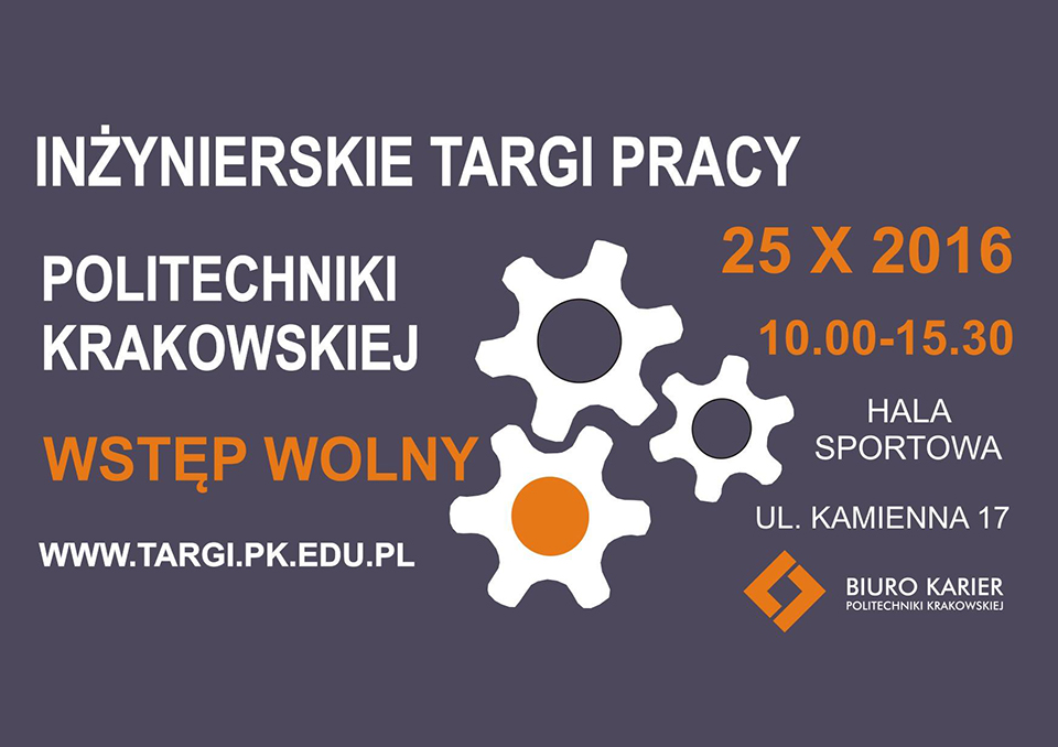 25.10.2016 w godz. 10.00-15.30 w hali sportowej Centrum Sportu i Rekreacji PK na ul. Kamiennej 17 odbędą się Inżynierskie Targi Pracy Politechniki Krakowskiej. Honorowy patronat nad targami objął Rektor uczelni, prof. dr hab. inż. Jan Kazior.