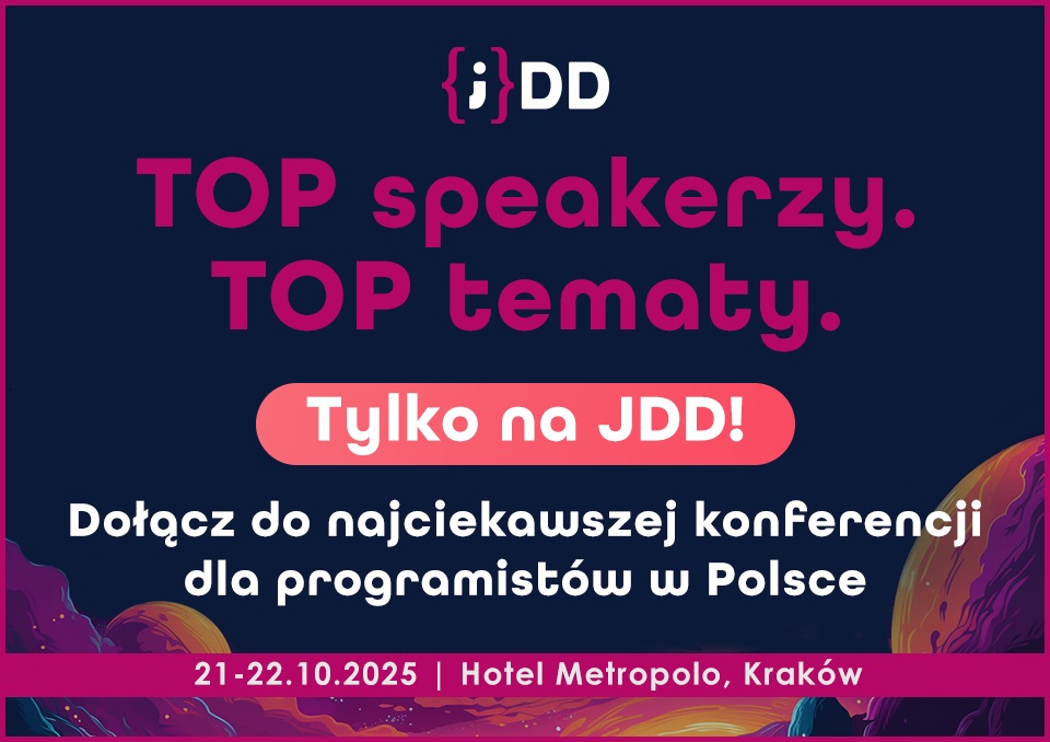 Architektura oprogramowania, testowanie i jakość kodu, najnowsze rozwiązania, w które warto wdrożyć oraz modne pułapki, w które nie warto inwestować czasu i zasobów. Do tego najlepsze praktyki w IT oraz kluczowe umiejętności miękkie. JDD 2025 to konferencja programistyczna, której program w kompleksowy sposób podejmuje najważniejsze tematy dla świadomych programistów. Dołącz do 19. edycji wydarzenia, która odbędzie się 21-22 października 2025 roku w Krakowie.