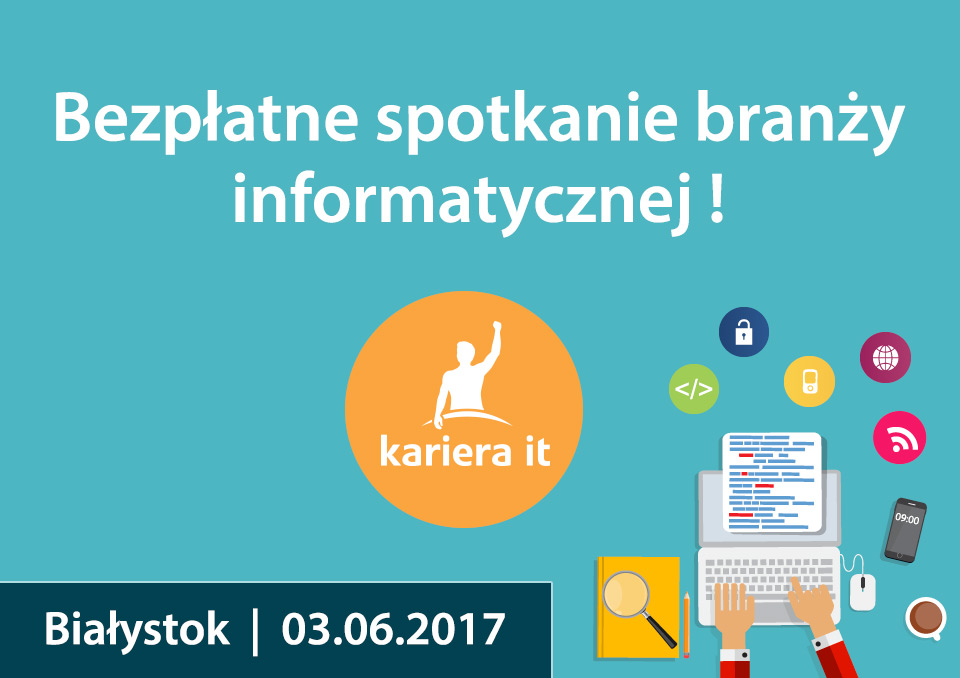 Już 03.06.2017r. zapraszam na kolejne spotkanie branży informatycznej Kariera IT dla województwa podlaskiego. Udział jest całkowicie bezpłatny, wystarczy zarejestrować się na stronie wydarzenia.