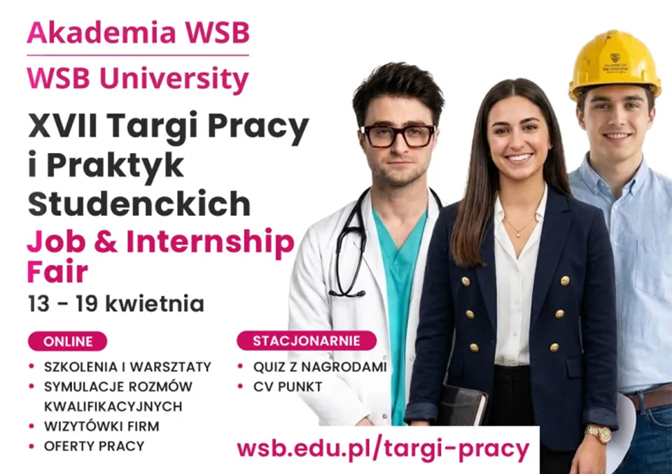 XVII edycja Targów Pracy i Praktyk Studenckich - Job and Internship Fair odbędzie się w dniach 13-19 kwietnia 2026 r. Wydarzenie realizowane będzie w formule hybrydowej - część aktywności dostępna będzie online, natomiast wybrane działania odbędą się stacjonarnie w siedzibach Akademii WSB.