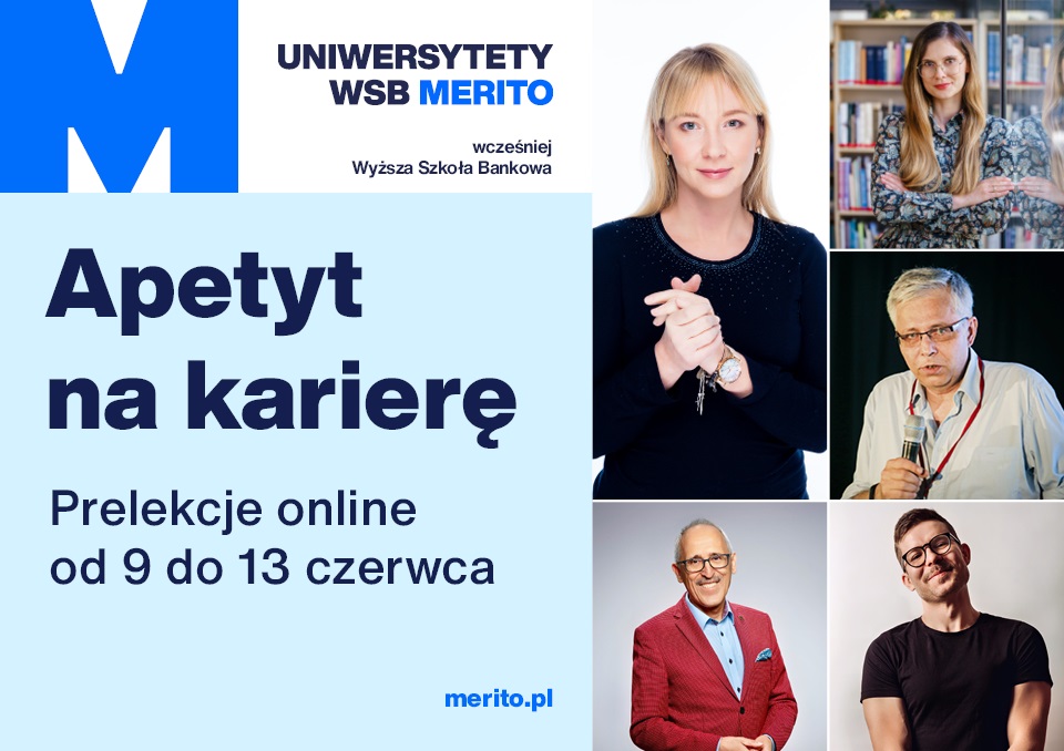 W dniach 9–13 czerwca 2025 r. Uniwersytety WSB Merito zapraszają wszystkich zainteresowanych rozwojem osobistym i zawodowym do udziału w wyjątkowym cyklu bezpłatnych warsztatów online pod hasłem „Apetyt na karierę”.