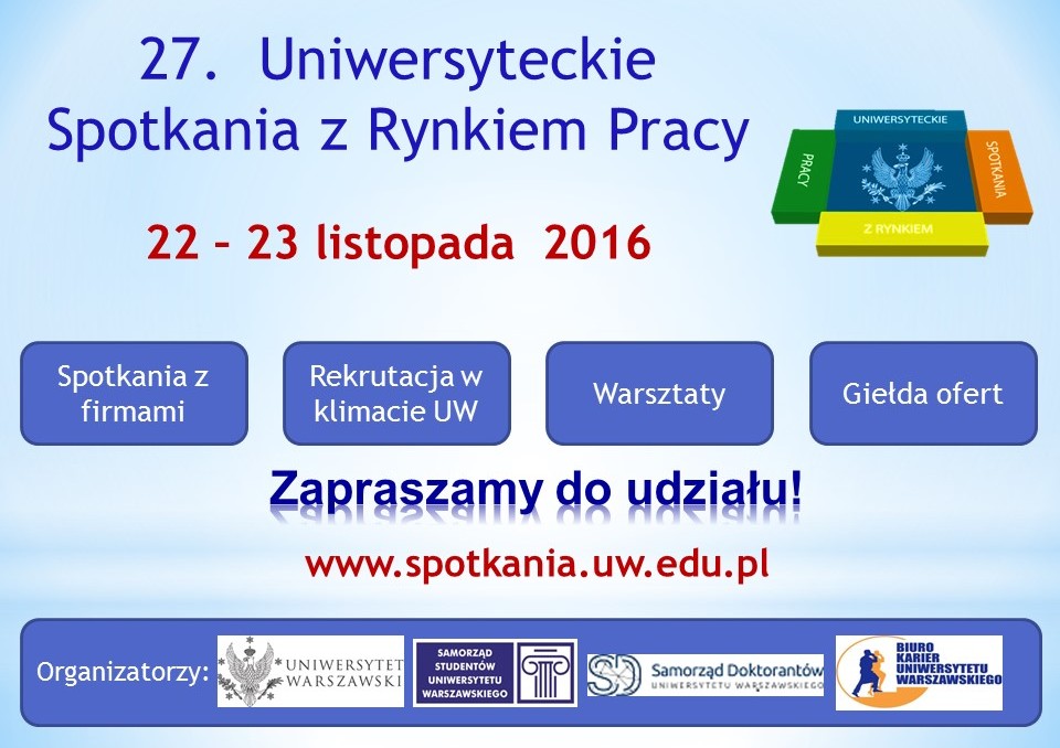 Biuro Zawodowej Promocji Studentów i Absolwentów Uniwersytetu Warszawskiego zaprasza na 27. edycję Uniwersyteckich Spotkań z Rynkiem Pracy, które odbędą się 22-23 listopada 2016 r. w Warszawie.