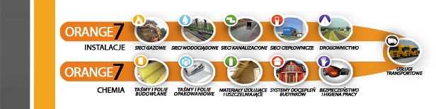 Firma Orange 7 działa w dwóch segmentach szeroko rozumianego rynku budowlanego, zajmując się dystrybucją materiałów instalacyjnych (sieci gazowe, sieci wodociągowe, sieci kanalizacyjne, sieci ciepłownicze, drogownictwo) oraz chemii budowlanej (taśmy i folie budowlane, taśmy i folie opakowaniowe, materiały izolujące i uszczelniające, systemy dociepleń budynków, bezpieczeństwo i higiena pracy). Swoje działania koncentruje na rynku województwa śląskiego, małopolskiego i opolskiego. W swojej ofercie posiada produkty i rozwiązania wszystkich producentów liczących się na rynku polskim i europejskim. Aktualnie dynamicznie rozwija sieci składów "Pecefał" i "Żeliwiarz" operujących w asortymencie sieci kanalizacyjnych i drogownictwa.