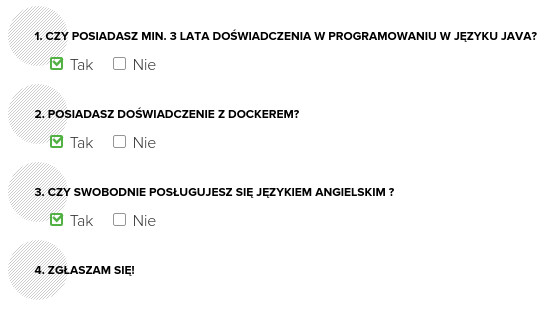 - Praca z najnowszymi technologiami: JAVA 1.8, Docker, Amazon Web Services