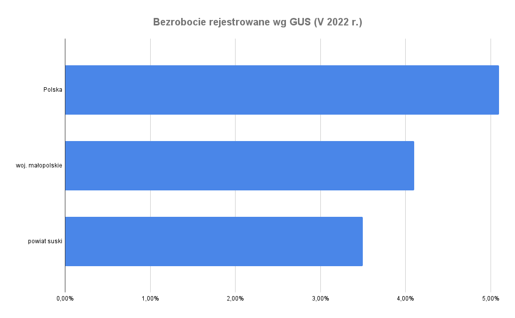 Zgodnie z danymi Głównego Urzędu Statystycznego stopa bezrobocia w Polsce w końcu maja 2022 r. była na poziomie 5,1%. Na tym województwo małopolskie i powiat suski wypadają bardzo korzystnie.