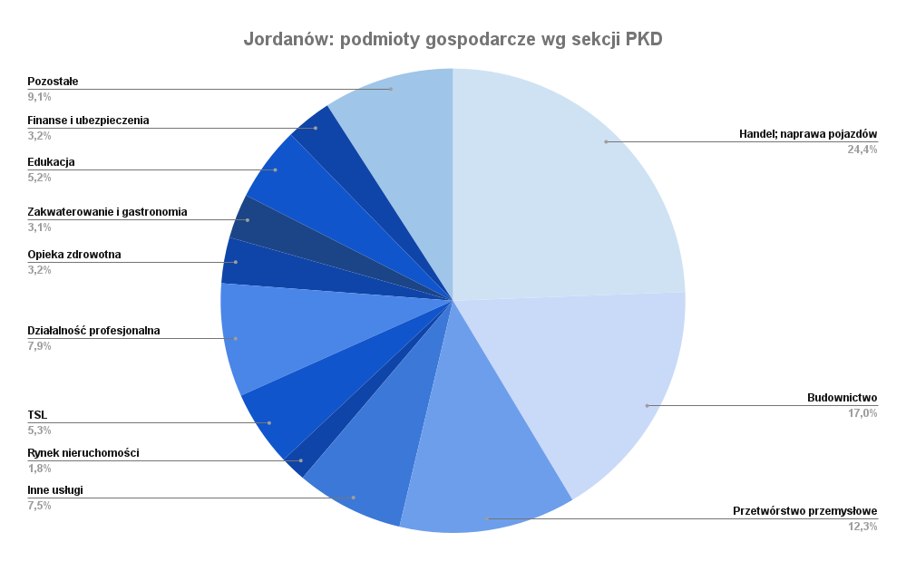 Jak wygląda sytuacja gospodarcza tego miejsca? Jordanów nie jest dużym ośrodkiem gospodarczym, niemniej można znaleźć tu firmy różnej wielkości. Zgodnie z rejestrem REGON (dane z końca maja 2022 r.) w gminie miejskiej funkcjonuje łącznie 717 podmiotów gospodarki narodowej. Najwięcej jest jednostek do 9 pracowników (łącznie 686). Grupę 25 podmiotów tworzą małe przedsiębiorstwa i instytucje, czyli zatrudniające od 10 do 49 pracowników. Podmiotów średnich (kadra rzędu 50-249 osób) jest 5, a jedna firma deklaruje zatrudnienie od 250 do 999 pracowników. Jeśli chodzi o profil działalności gospodarczej, panuje tu spora różnorodność.