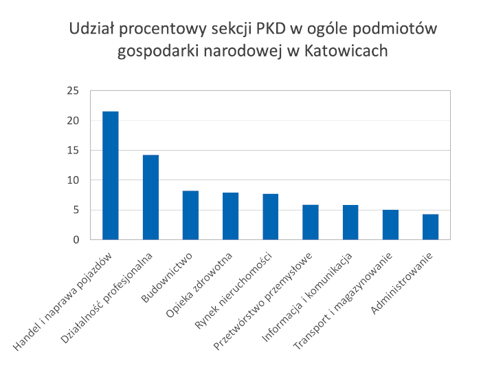 Na terenie Katowic wyróżnia się sektor usługowy. Firmy z branż handlowej, transportowej, nieruchomości, gastronomicznej, kosmetycznej, telekomunikacyjnej czy motoryzacyjnej dają zatrudnienie blisko jednej trzeciej mieszkańców. Większość podmiotów gospodarczych zarejestrowanych na terenie Katowic reprezentuje sektor prywatny.