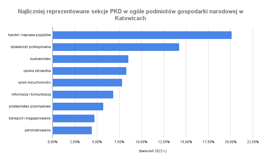 W Katowicach działa kilkadziesiąt tysięcy firm różnej wielkości, w tym kilkadziesiąt dużych i międzynarodowych koncernów, które pobudzają gospodarczo ten obszar. Wśród wiodących obszarów działalności należy wymienić firmy handlowe, podmioty prowadzące działalność profesjonalną, naukową bądź techniczną, przedsiębiorstwa budowlane, zakłady przemysłowe oraz placówki opieki zdrowotnej. Rozwija się także branża nieruchomości oraz technologiczna. Tradycyjnie jest to także obszar przemysłu energetycznego. Warto wziąć jednak pod uwagę, że zakłady górnicze stanowią 0,2% wszystkich jednostek gospodarczych w Katowicach. Do liczących się na katowickim rynku przedsiębiorców należą między innymi Tauron Polska Energia SA, Polska Grupa Górnicza, Famur SA, GK Farmacol SA, Elektrobudowa SA, Grupa 3S, Unilever i inne.