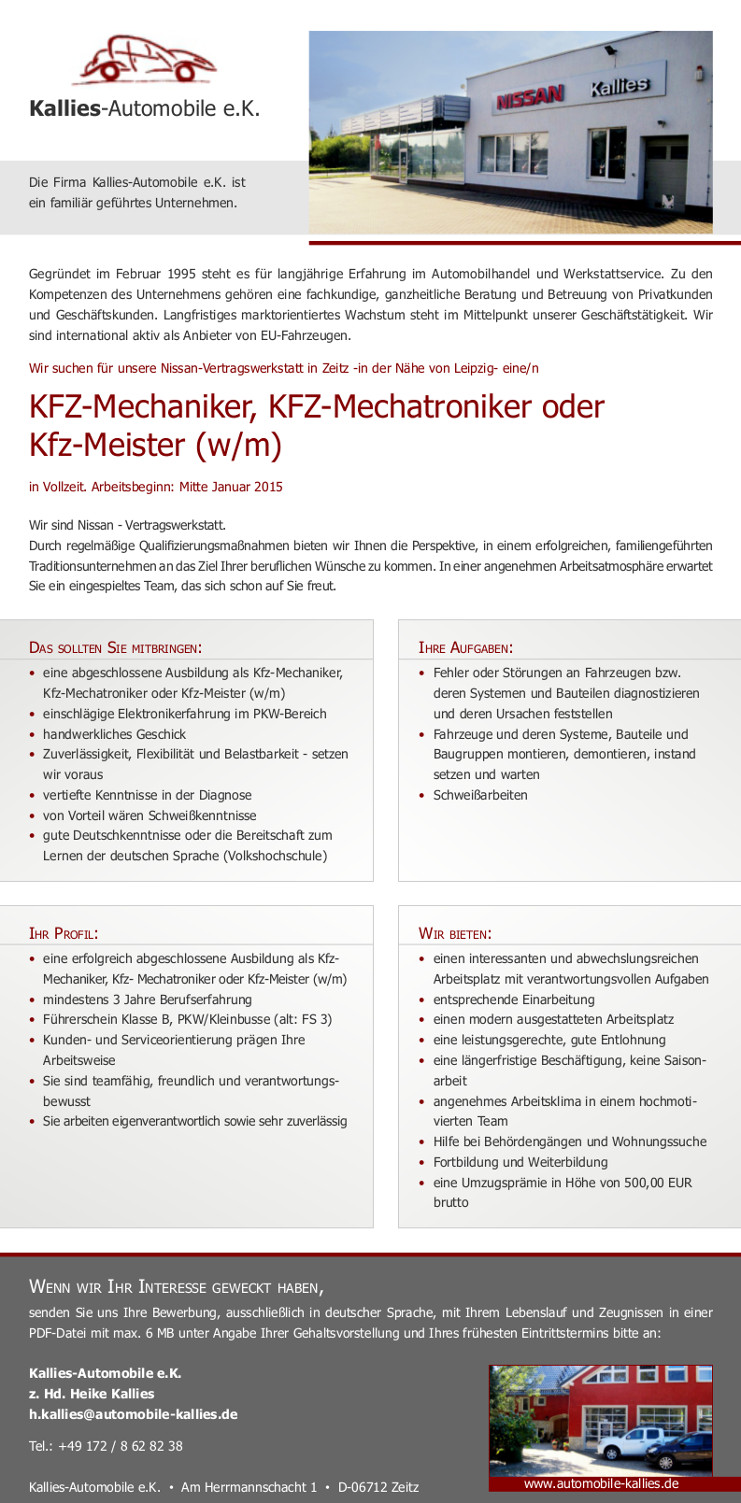 KFZ-Mechaniker, KFZ-Mechatroniker oder Kfz-Meister (w/m)
