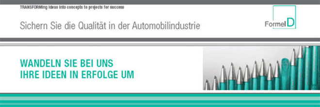 Grupa przedsiębiorstw Formel D jest międzynarodową prężnie rozwijającą się firmą świadczącą usługi dla przemysłu motoryzacyjnego. Zatrudniamy 4000 pracowników w 88 oddziałach na całym świecie. Innowacyjnie, dyspozycyjnie, elastycznie i przyszłościowo rozwijamy przodujące na rynku koncepcje oraz złożone zadania w zakresie procesów produkcji. Naszymi klientami są wiodące firmy przemysłu motoryzacyjnego jak również ich poddostawcy. Firmy te doceniają nas już od 20 lat jako kompetentnych partnerów we wsparciu technicznym z zakresu FLOWing., KNOWing., QUALIFYing., CARing., i CREATing.