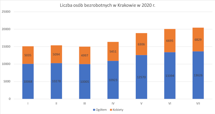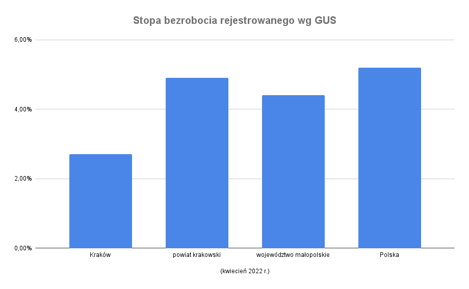 Czy trudno zdobyć w Krakowie pracę od zaraz? Liczba osób bezrobotnych w mieście wynosi 13,8 tys. (kwiecień 2022 r.). Stopa bezrobocia w Krakowie utrzymuje się na bardzo niskim poziomie. W końcówce kwietnia 2022 r. wyniosła 2,7%. Kraków wypada dobrze na tle województwa, gdzie bezrobocie w podanym okresie bezrobocie utrzymywało się na poziomie 4,4%, a także na tle kraju (stopa bezrobocia równa 5,2%).