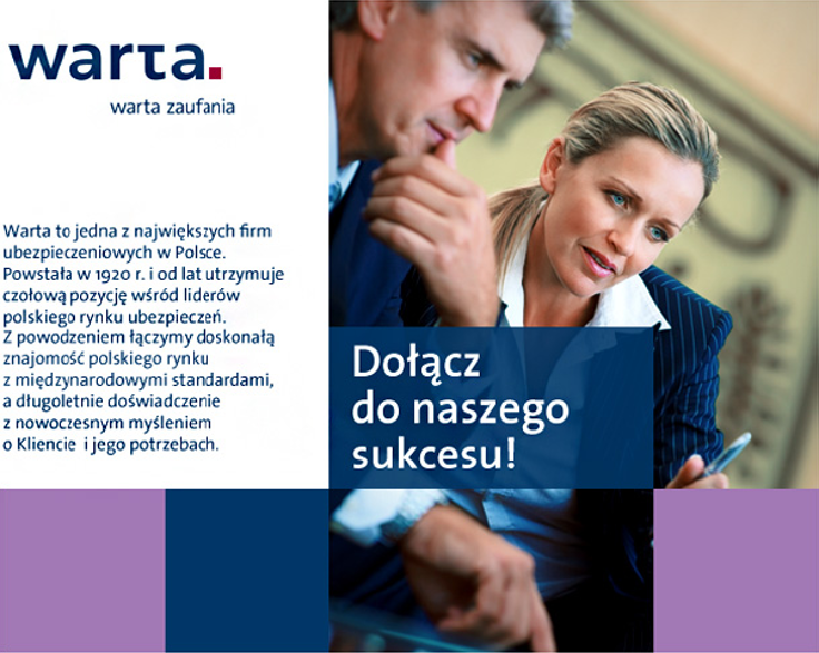 Poszukujesz nowych wyzwań? Chcesz odnieść sukces w nowoczesnej firmie ubezpieczeniowej? Planujesz dalszy rozwój zawodowy? Z nami jest to możliwe! Warta TUnŻ – firma o ugruntowanej pozycji na rynku ubezpieczeń życiowych, zaprasza kandydatów do aplikowania na stanowisko: