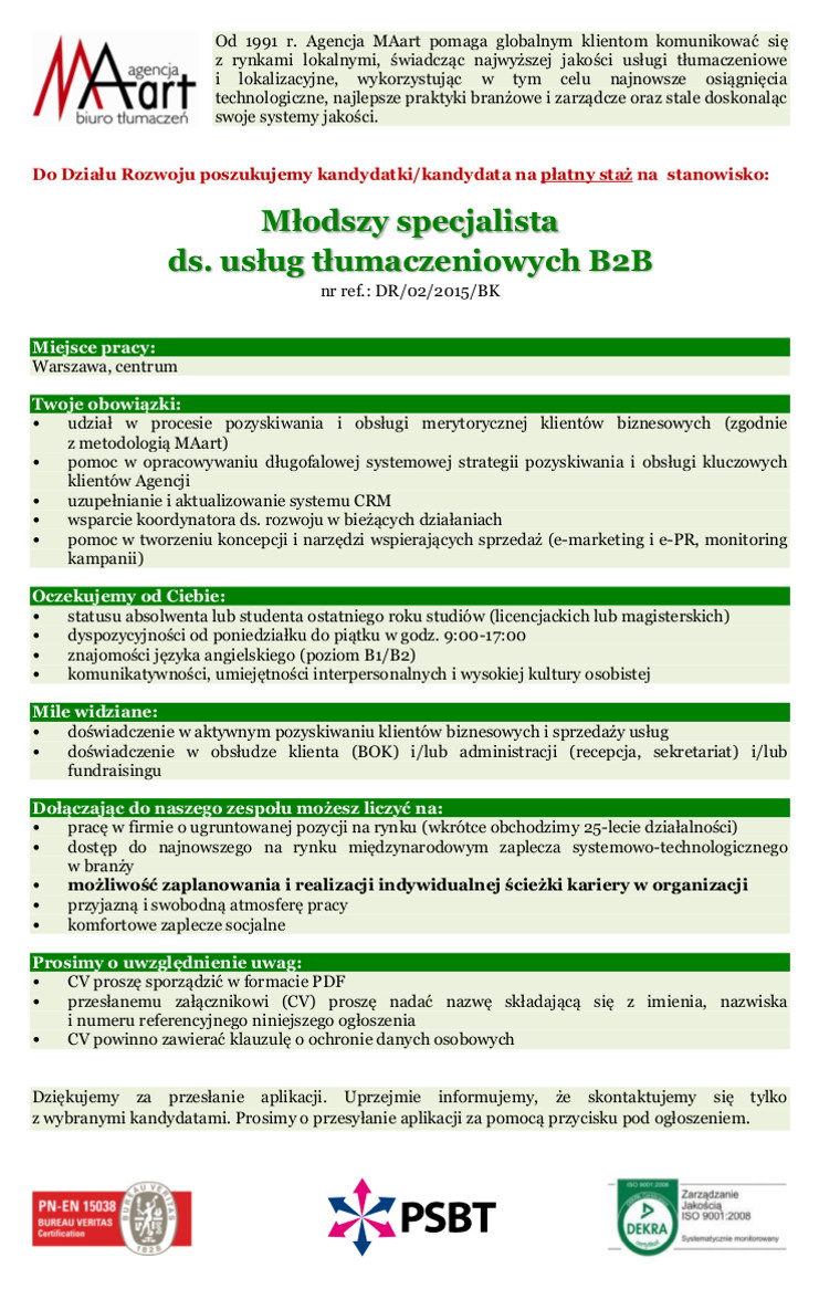Młodszy specjalista ds. usług tłumaczeniowych B2B