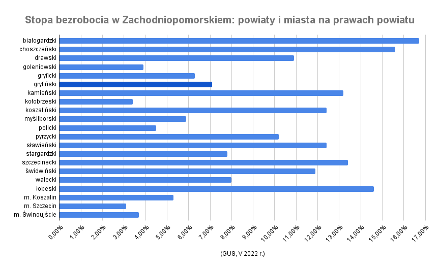 Poziom bezrobocia w powiecie gryfińskim jest nieco wyższy od średniej wojewódzkiej. Pod koniec maja 2022 r. stopa bezrobocia obliczona dla powiatu była na poziomie 7,1%, a dla woj. zachodniopomorskiego – 6,7%.