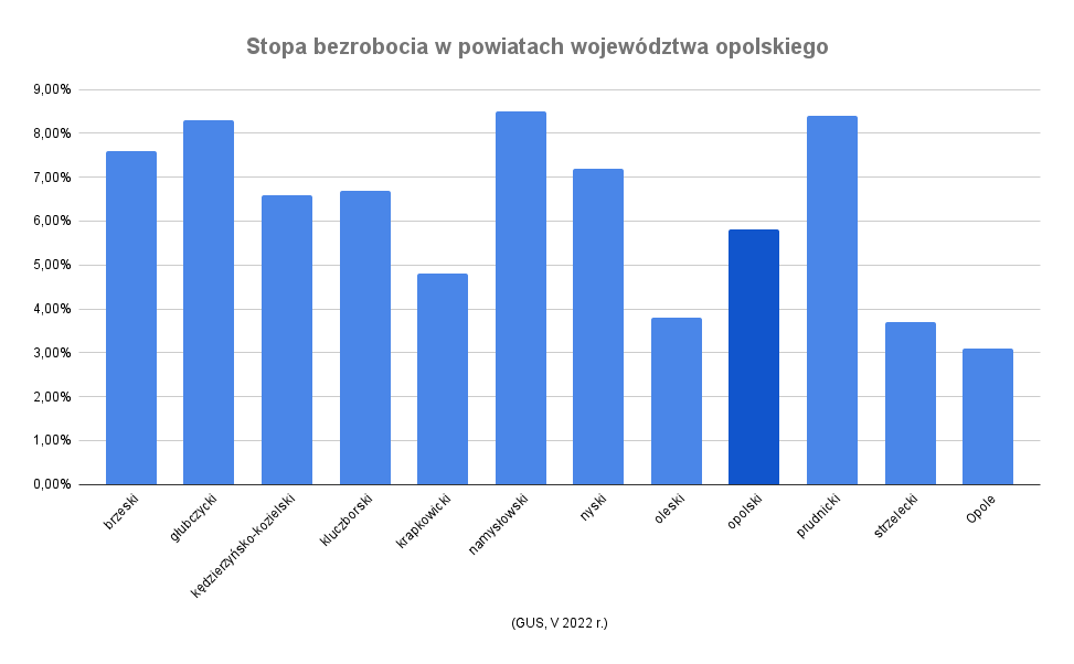 Województwo opolskie cechuje silne zróżnicowanie, jeśli chodzi o poziom bezrobocia. Stopa bezrobocia rejestrowanego najniższa jest w Opolu (3,1% w maju 2022 r., GUS), a najwyższa w powiecie namysłowskim (8,5%). Jak na tym tle wypada powiat opolski? W podanym okresie wskaźnik bezrobocia był tu na poziomie 5,8%.