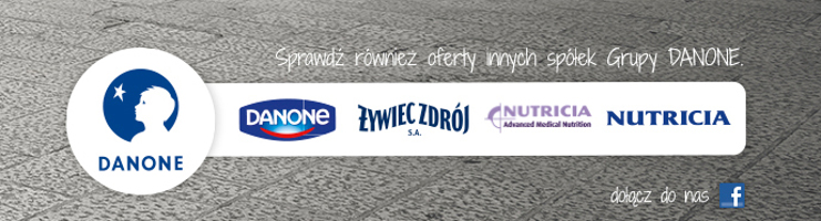 Jeśli marzysz o pracy w międzynarodowej firmie posiadającej znane marki i inspirującą misję, Danone jest miejscem którego poszukujesz. Activia, Evian, Oikos czy NUTRICIA to jedne z najpopularniejszych marek na świecie. Nasza misja "dostarczenie zdrowej żywności jak największej liczbie ludzi" odzwierciedla naszą troskę o ludzi i ich rozwój. Danone zajmuje pierwsze miejsce na rynku świeżych produktów mlecznych oraz drugie na rynku wód butelkowanych, żywności dla dzieci i żywności medycznej w Europie. Nasza firma jest również obecna na rynkach krajów rozwijających się. Dla osób z pasją, lubiących wyzwania, poszukujących możliwości rozwoju, Danone ma coś wyjątkowego do zaoferowania.....