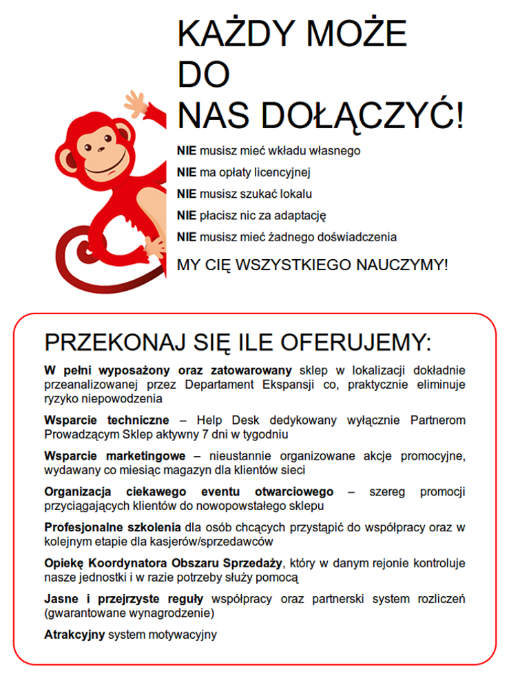 Małpka S.A. to spółka rozwijająca nową sieć sklepów convenience na terenie naszego kraju. Segment ten ma w Polsce bardzo duży potencjał na tle całego rynku detalicznego. Dzięki wieloletniemu doświadczeniu specjalistów z dziedziny handlu detalicznego, którzy zarządzają siecią oraz dynamicznemu przyrostowi lokalizacji, sieć ma szansę bardzo szybko wejść do grona liderów w sektorze handlu tradycyjnego.