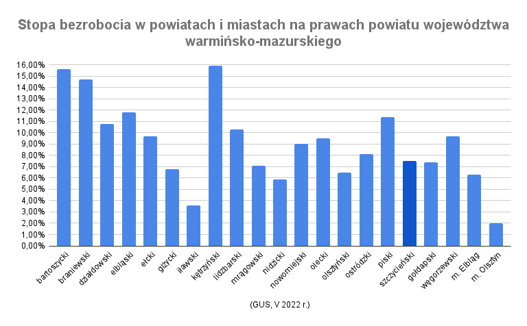 Województwo warmińsko-mazurskie odznacza się stopą bezrobocia znacznie przewyższającą poziom krajowy. W końcu maja 2022 r. wskaźnik dla województwa wynosił 7,6%, dla kraju 5,1% (dane GUS). Stopa bezrobocia dla powiatu szczycieńskiego jest z kolei zbliżona do średniej wojewódzkiej i wynosiła 7,5%. Jak powiat ten wypada na tle innych części województwa?
