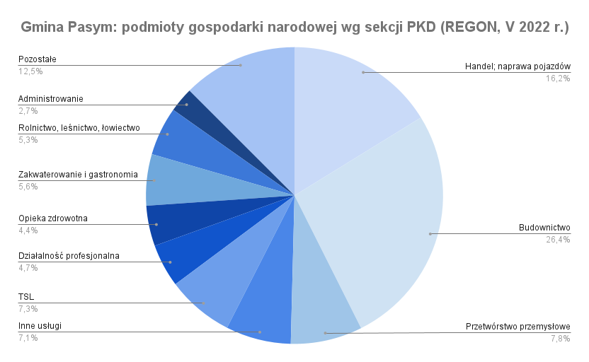 Miasto Pasym stanowi siedzibę dla 248 podmiotów gospodarki narodowej, na terenie wiejskim gminy działają z kolei 202 (stan REGON na koniec maja 2022 r.). Spośród funkcjonujących na terenie całej gminy miejsko-wiejskiej 450 podmiotów najwięcej reprezentuje następujące sekcje PKD: