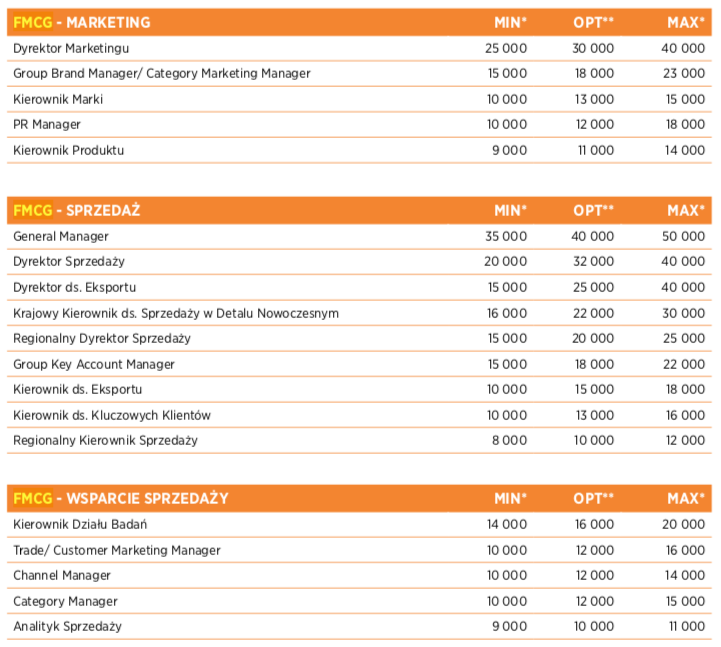 Ze względu na duże zróżnicowanie w strukturach zatrudnienia, praca w branży FMCG wiążę się z także z różną skalą wynagrodzeń. Według Raportu Płacowego 2018 przygotowanego przez Hays Poland wysokość pensji na poszczególnych stanowiskachpracy przedstawia się następująco: