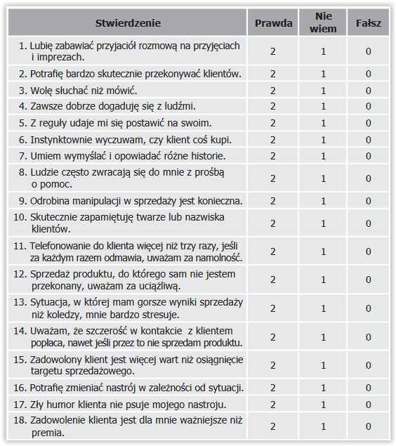Teraz porównaj punktację - wyższy wynik oznacza twoje predyspozycje do pracy w sprzedaży.