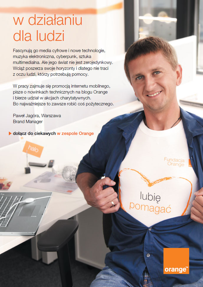 Orange Polska to przestrzeń dla ciekawych ludzi, którzy potrafią dzielić swoją pasję z zaangażowaniem w pracy. To, że nasi pracownicy to osoby aktywne, realizujące się na wielu polach – podróżnicy, odkrywcy, ludzie, którzy rozwijają swoje talenty plastyczne czy muzyczne – jest dla nas tak samo ważne jak to, że mają otwarte umysły - patrzą na zadania i problemy z więcej niż jednej perspektywy. To dzięki wiecznie ciekawym, Orange każdego dnia tworzy cyfrowy świat dla swoich klientów, czyniąc go nowoczesnym i innowacyjnym, a wciąż interesującym i dostępnym dla każdego. Jeśli interesuje Cię rozwój osobisty i zawodowy… i masz pasję, dołącz do zespołu Orange.