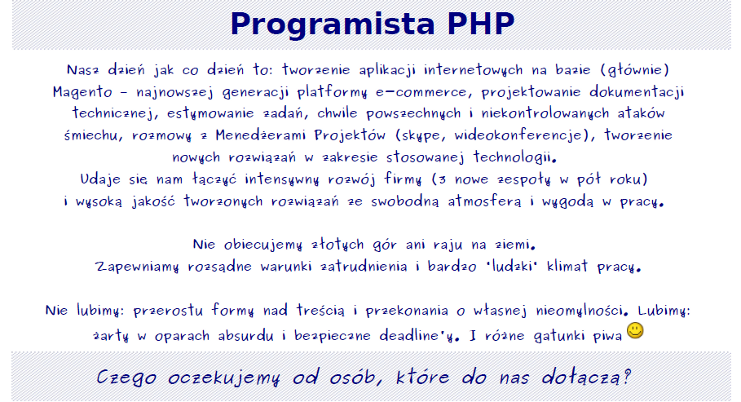 Przede wszystkim: solidnego rozumienia obiektowości , ze wskazaniem na PHP OOP. Całej reszty możemy nauczyć, chociaż jeżeli mieliście styczność z Magento, Zend Framework, lub CMSem eZ Publish, to wielce prawdopodobne, że będziecie mieli łatwiejszy "start".