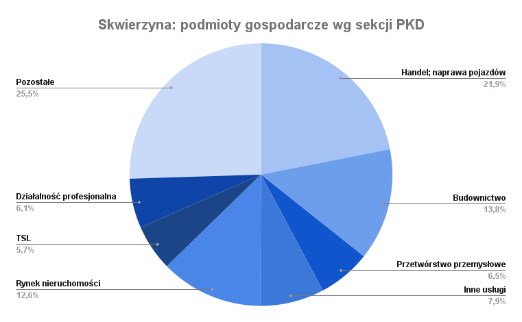 Najczęściej wskazywane sekcje PKD tutejszych podmiotów gospodarki to: