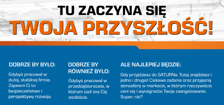 W naszym markecie SATURN w BYDGOSZCZY możesz natychmiast zacząć działać, ponieważ szukamy ludzi, którzy jeszcze dziś chcą rozpocząć karierę!